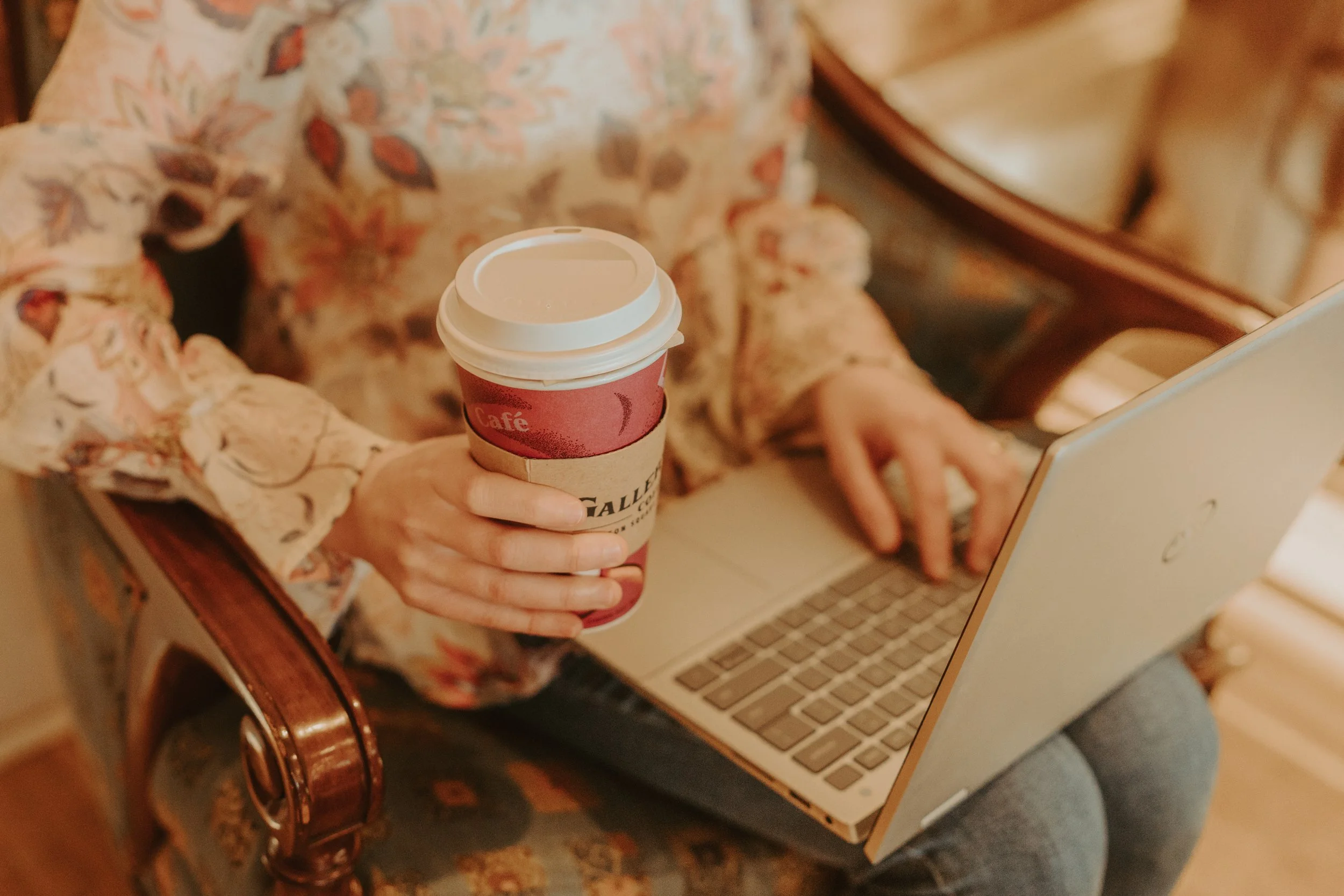 Sara Claudia cozy on her laptop with a coffee in hand.